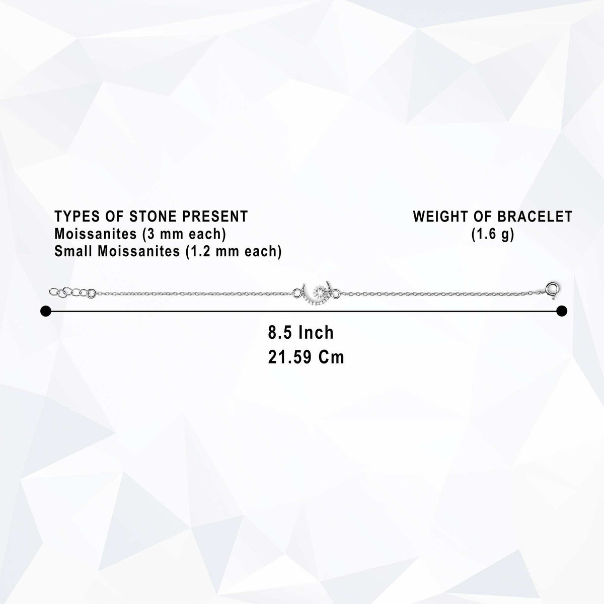 The bracelet features a dazzling 3mm moissanite at its center, representing the Sun, radiating vitality and positivity. Surrounding it are nine smaller 1.2mm moissanites, symbolizing the stars around the Moon, capturing the calm and reflective energy of the night sky. Lightweight at just 1.6g, this bracelet captures energy in motion, echoing the natural rhythms of the Sun and Moon in a radiant cosmic dance.